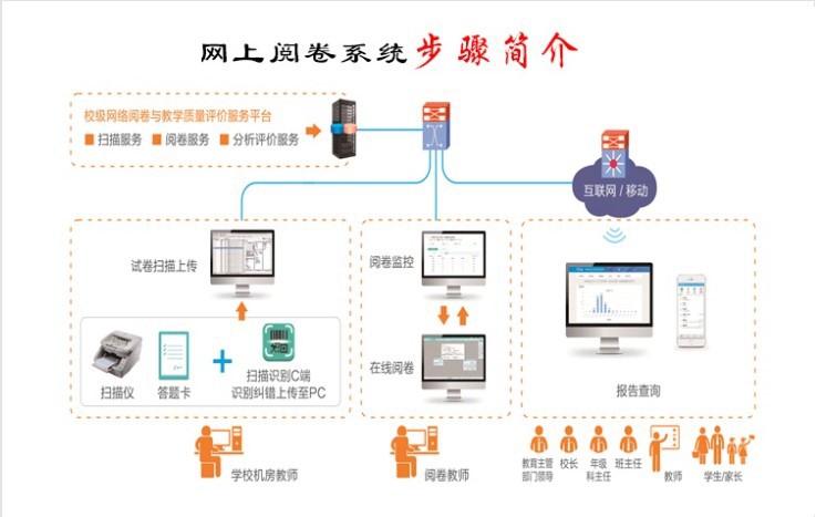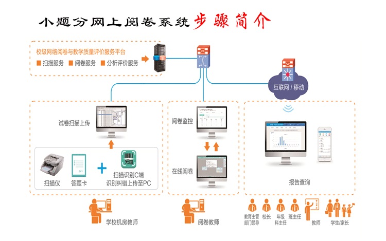 產(chǎn)品可用云端服務器也可本地化部署,讓學校有更多的自主選擇。適用于小學、初中及高中的月考、期中、期末等考試,讓學生盡早適應小升初、中考閱卷、高考閱卷的形式,普通紙張印刷的答題卡即可掃描,操作簡單上手快、節(jié)約學校考務成本,節(jié)省考務教務時間、手機電腦快速閱卷,支持學生、家長、教師、主任、校長多角色查詢試卷和分析報告,為學生提供個性化診斷報告,為學科提供知識點題型分析,為教研組教務提供學科分析報告。