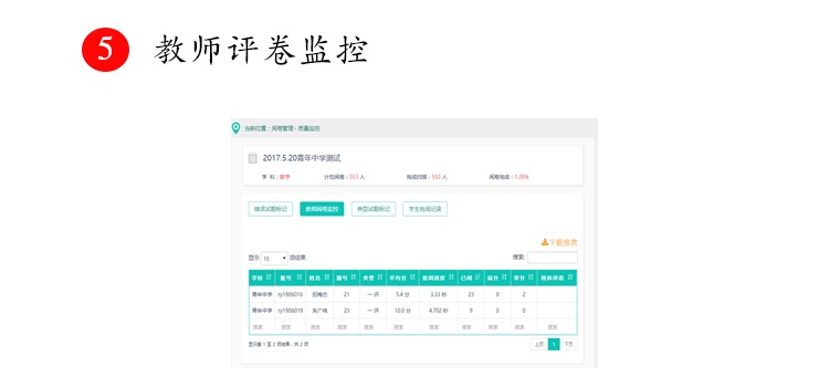 通過題、教師和學校不同維度進行閱卷進度的實時監(jiān)控;并就教師的閱卷速度、滿分率、零分和平均分進行統(tǒng)計分析;1.工作量統(tǒng)計;2.小題評卷進度;3.閱卷質(zhì)量監(jiān)控等。