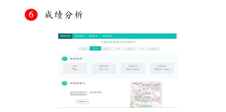 適用于小學、中學、大學、職業(yè)學校,高中月考、模擬考、期中期末考等各種考試閱卷工作,免去主觀小題登統(tǒng)和匯總,快速進行成績合成和診斷分析。普通紙張印刷的答題卡即可掃描,操作簡單上手快、節(jié)約學??紕粘杀?,節(jié)省考務教務時間、手機電腦快速閱卷,讓學生盡早適應小升初、中考閱卷、高考閱卷的形式,支持學生、家長、教師、主任、校長多角色查詢試卷和分析報告,為學生提供個性化診斷報告,為學科提供知識點題型分析,為教研組教務提供學科分析報告。