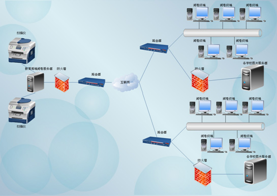 志渡閱網(wǎng)上閱卷互聯(lián)網(wǎng)應(yīng)用方案拓撲圖如下: