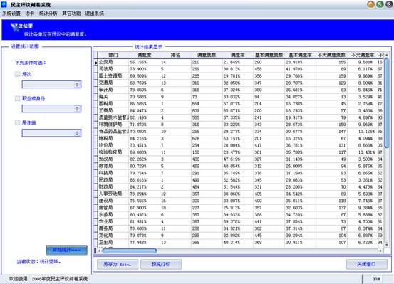 3、[統(tǒng)計(jì)分析]-[全體滿意度],主要統(tǒng)計(jì)各部門各身份職業(yè)或居住地的評(píng)議滿意度。