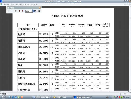 1、[統(tǒng)計(jì)分析]-[打印輸出],主要統(tǒng)計(jì)各部門的總滿意度及排名。